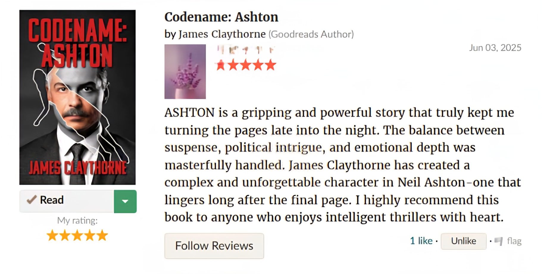 "Codename Ashton", would appeal to readers with an interest in the Cold War era and its aftermath and would find the setting and themes particularly enagaging. The story's exploration of betrayal, revenge, and family secrets would resonate with a broad audience, including those who enjoy character-driven narratives and intricate plotlines.
